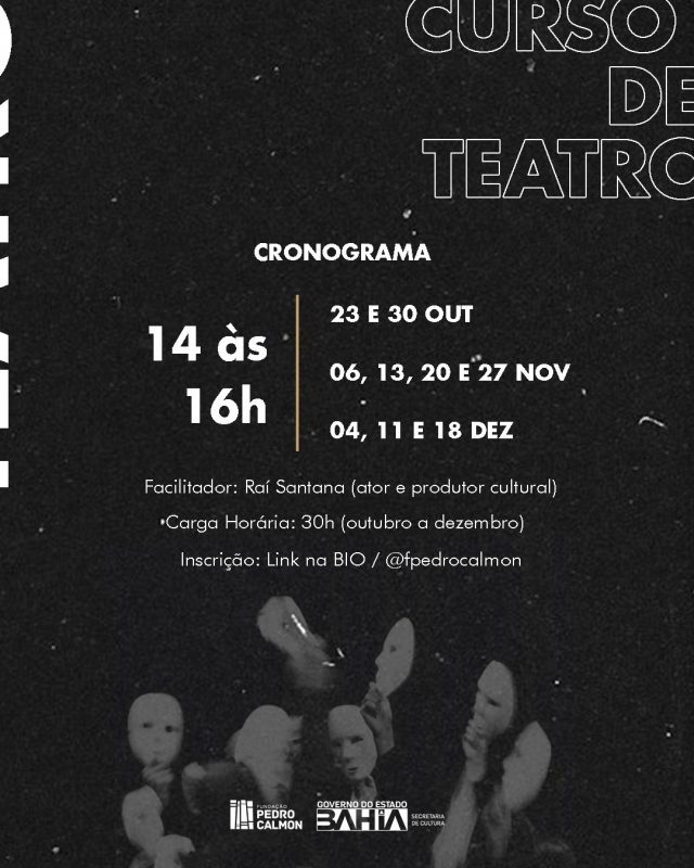 A Fundação Pedro Calmon (FPC), vinculada à Secretaria de Cultura da Bahia (SecultBA), promove curso de teatro para jovens e adultos na Biblioteca Juracy Magalhães Júnior – Salvador. O curso acontece nos dias 23 e 30 de outubro – 6, 13, 20 e 27 de novembro e 4, 11 e 18 de dezembro, às quartas-feiras, das 14h às 16h.