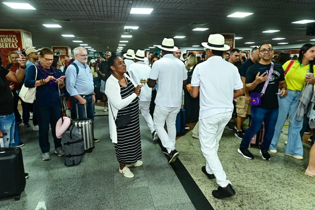 Apresentação – Com proposta cênica concebida para valorizar a identidade cultural da Bahia e surpreender quem desembarca na capital, o receptivo tem início com quatro sambistas posicionados em uma mesa no saguão, interpretando “Samba da Minha Terra”, de Dorival Caymmi.