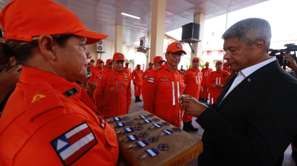 Em cerimônia pelo reconhecimento e lembrança de uma das maiores tragédias climáticas recentes no país, 49 bombeiros baianos foram homenageados na sede do Corpo de Bombeiros Militar da Bahia (CBMBA), na manhã desta quinta-feira (13), pelo trabalho realizado nas enchentes que atingiram o Rio Grande do Sul em 2024. O governador Jerônimo Rodrigues prestigiou a homenagem e entregou a Medalha de Serviços Relevantes SD BM Eduardo Santos Góes aos profissionais que se destacaram na ação de resgate e assistência humanitária.