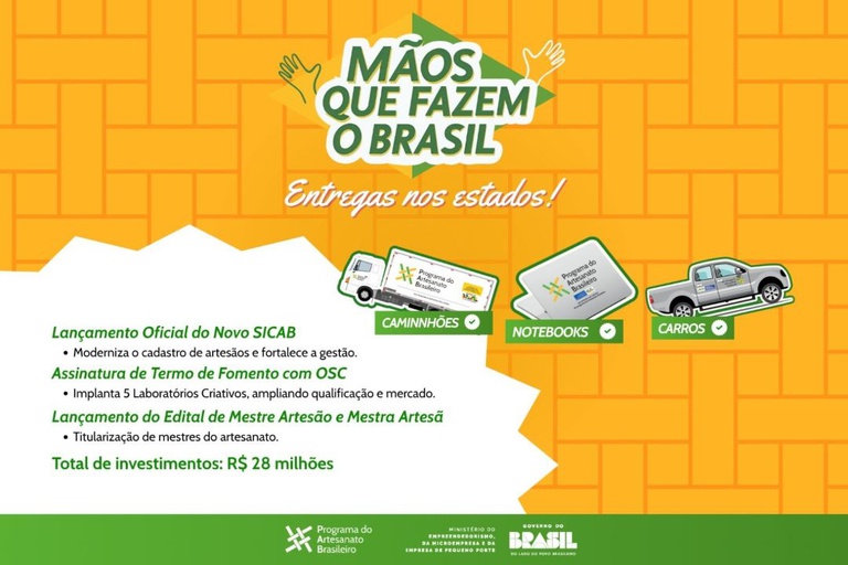 No Mês do Artesão e nos 35 anos do Programa do Artesanato Brasileiro (PAB), o Governo do Brasil anunciou, nesta terça-feira, 31 de março, por meio do Ministério do Empreendedorismo, da Microempresa e da Empresa de Pequeno Porte (MEMP), um conjunto de medidas para ampliar a formalização e fortalecer o setor em todo o país. Ao todo, são cerca de R$ 28 milhões em investimentos.