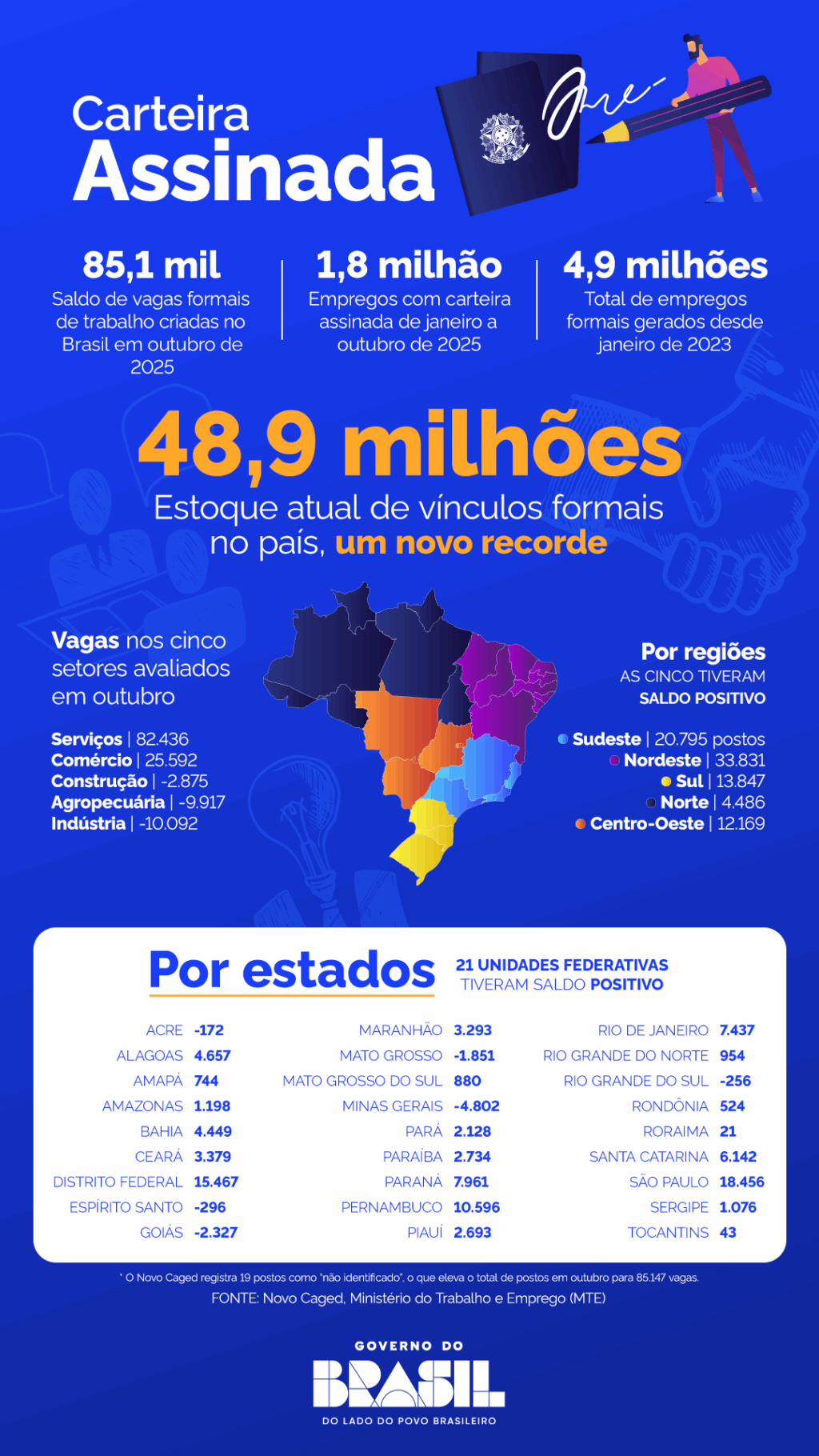 O Brasil alcançou o patamar de 1,8 milhão de empregos com carteira assinada entre janeiro e outubro de 2025, com saldos positivos nas 27 Unidades da Federação e em todos os grandes grupamentos econômicos no período. O resultado elevou o número total de vínculos formais ativos ao recorde de 48,99 milhões no país. Desde janeiro de 2023, início da atual gestão do Governo do Brasil, já são 4,9 milhões de vagas criadas. Os dados são do Novo Caged e foram divulgados nesta quinta-feira, 27 de novembro, pelo Ministério do Trabalho e Emprego.
