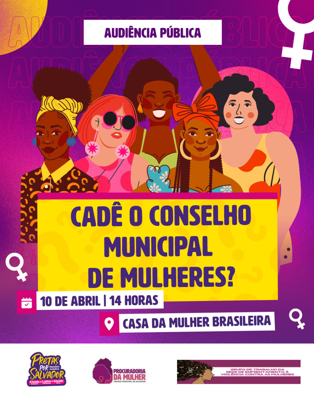 A Procuradoria da Mulher da Câmara Municipal de Salvador, coordenada pelo vereadora Laina Crisóstomo (PSOL), do mandato coletivo Pretas Por Salvador, em parceria com a Rede de Enfrentamento à Violência Contra Mulher, convoca a população para audiência pública “Cadê o Conselho Municipal de Mulheres?”. O debate aberto à população acontece nesta quarta-feira (10), a partir das 14h, na Casa da Mulher Brasileira, na Avenida Tancredo Neves.